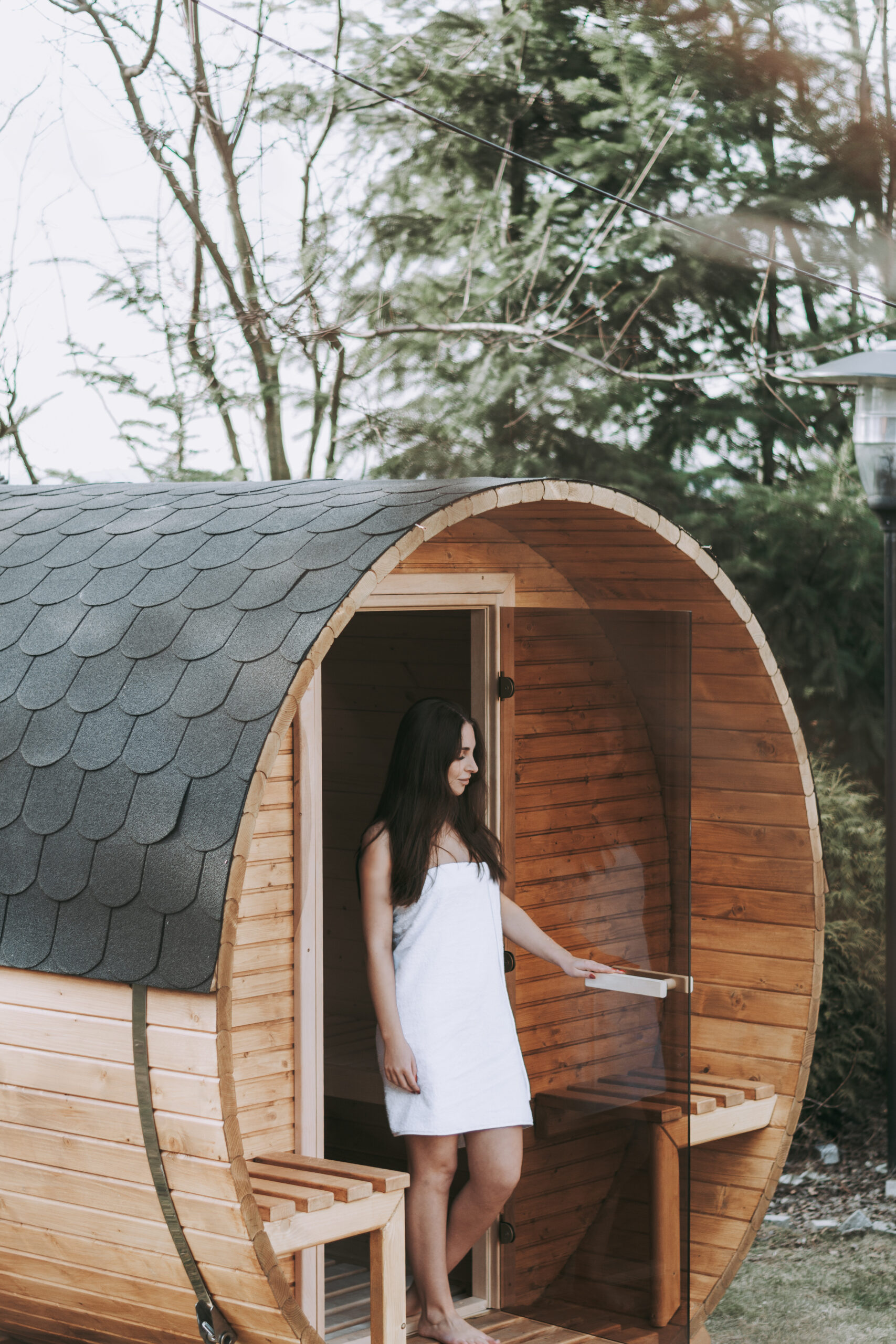 Zrelaksuj się w swoim ogrodzie dzięki z przedsionkiem, wykonanej ze świerku syberyjskiego i olchy, z piecem na drewno ETNA 12 oraz eleganckim oświetleniem LED. Hartowane szklane drzwi, stalowe obejmy i dach pokryty gontem gwarantują trwałość i wyjątkowy komfort. Dostępna od ręki – stwórz swoją prywatną strefę wellness już dziś!
